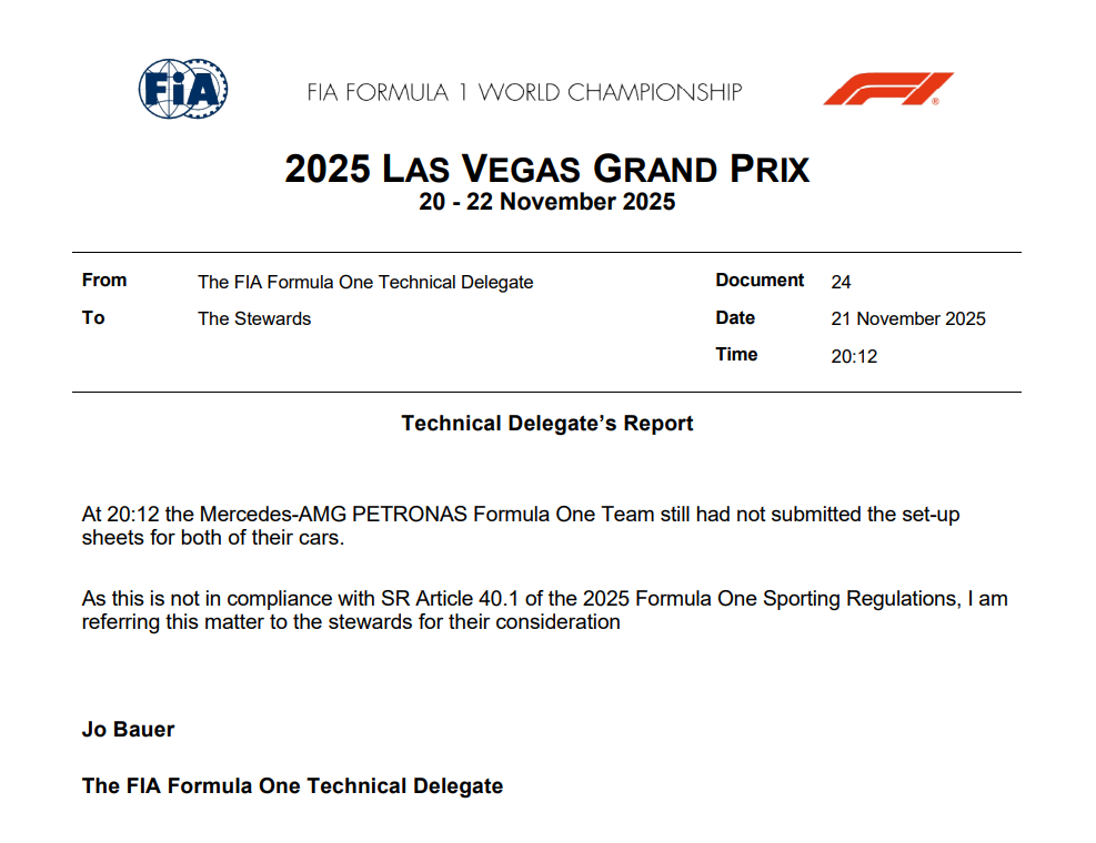 La pista se seca y Lance Stroll (Aston Martin) es el primer piloto en cambiar a neumáticos intermedios en Las Vegas. Mercedes será sancionado por no entregar a la FIA la hoja de setup de sus monoplazas a tiempo.