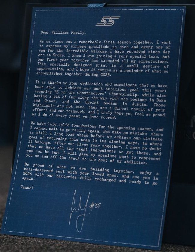 Carlos Sainz cerró su primera temporada en Williams con una emotiva carta dirigida a todos los integrantes de la escudería, en la que agradece el trabajo colectivo y el espíritu de equipo. Desde el inicio del mensaje, el español destacó el impacto que tuvo su llegada a Grove y el vínculo que construyó con el grupo.