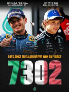 Cuando Giancarlo Fisichella cruzó victorioso la meta del Grand Prix de Malasia de 2006, el 19 de marzo de aquel año, no podía saber que aquella tercera victoria en la Fórmula 1 sería su último halago en la máxima categoría ni tampoco la de un piloto italiano en dos décadas.