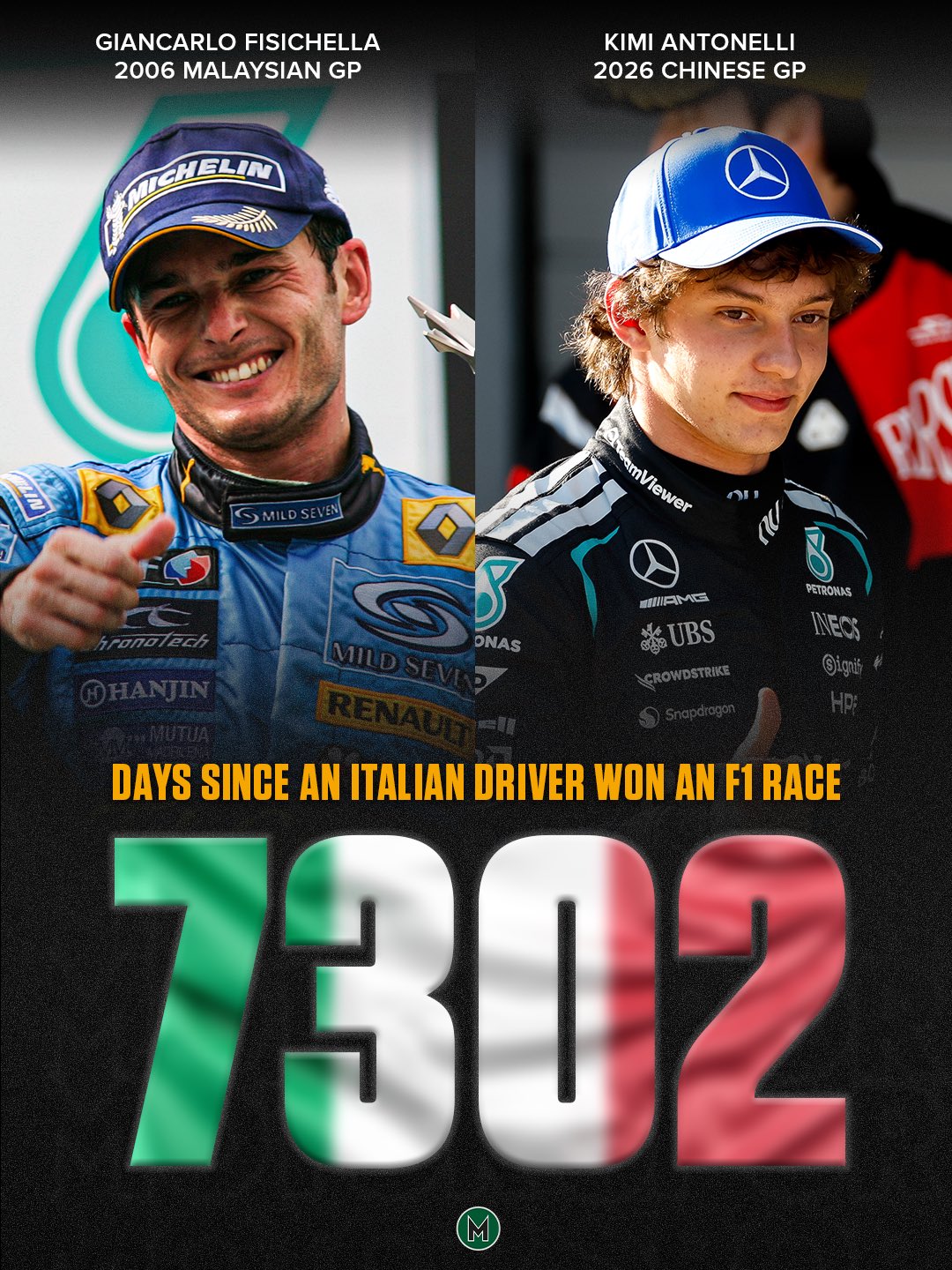 Andrea Antonelli, su madre Veronica no suele llamarlo Kimi, sino Andy, nació 159 días después de la victoria de Fisico en Malasia, al mes ya frecuentaba los autódromos, a los 11 ya formaba parte de la Academia Mercedes y a los 19 años, 6 meses y 18 días volvería a impulsar la ejecución de las estrofas del Fratelli d’Italia en lo alto de un podio, esta vez en Shanghai (China). Habían transcurrido 7302 días desde la irredenta victoria de Fisichella, exactamente cuatro días antes de que se cumplieran 20 años de aquella vieja memoria.