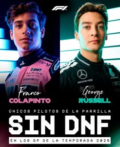 Franco Colapinto (Alpine) y George Russell (Mercedes) son los únicos pilotos de la temporada 2025 de la Fórmula 1 que completaron todas las carreras que largaron sin registrar un solo abandono. Dicho dato los distingue en un Campeonato atravesado por la alta exigencia competitiva en el caso del británico y por las dificultades técnicas que rodearon al argentino a lo largo del año.
