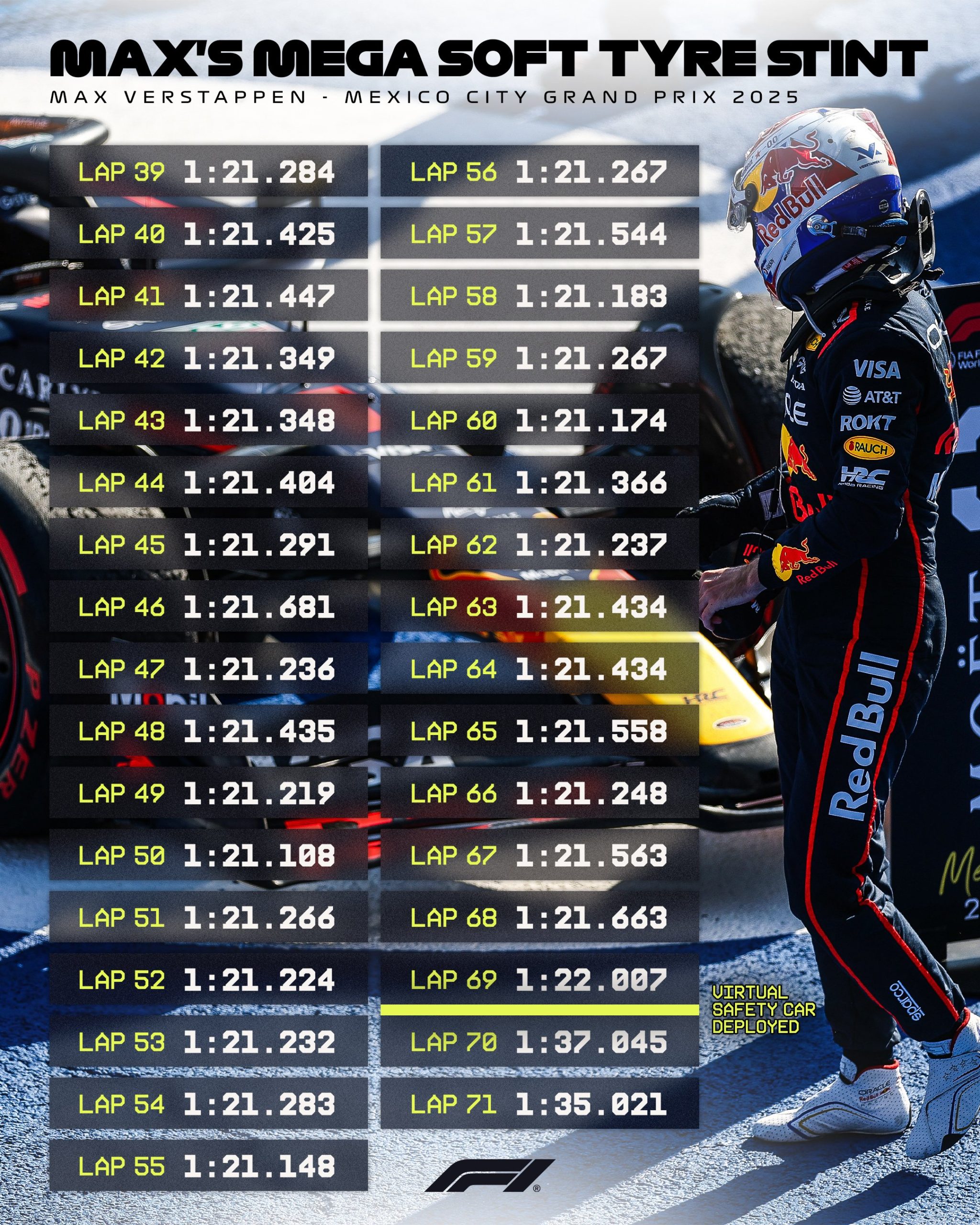 La segunda razón es la estrategia distinta que decidió Hannah Schmitz: largar con cubiertas medias y estirar la detención. Sin mucho grip con ese juego, Verstappen hizo un primer stint relativamente cauteloso pero sin esquivar peleas francas, como la que libró contra Lewis Hamilton. Tenía como medida los stints de los líderes con cubiertas blandas: cuando el líder Norris se detuvo en el giro 34, supo cuánto podían durar en su coche. Precisamente, entró a los pits en el giro 37, cuando quedaban 34 vueltas de carrera…