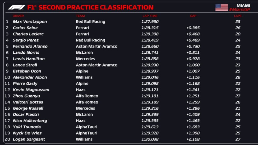 El mexicano Sergio «Checo» Pérez puso al otro Red Bull en la cuarta posición y el asturiano Fernando Alonso volvió a colocarse dentro del top 5 con el Aston Martin, al quedar a 73 centésimas del líder. Lando Norris, Lewis Hamilton, Lance Stroll, Esteban Ocon y Alexander Albon, completaron las principales posiciones.