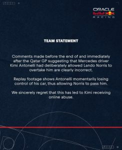 Por su parte, Red Bull emitió un comunicado frente a lo sucedido: «Los comentarios hechos antes y después del GP de Qatar, sugiriendo que el piloto de Mercedes, Kimi Antonelli dejó deliberadamente pasar a Lando Norris, son claramente incorrectos. Las repeticiones muestran que perdió momentáneamente el control. Lamentamos sinceramente que esto haya derivado en abusos en línea contra Kimi».