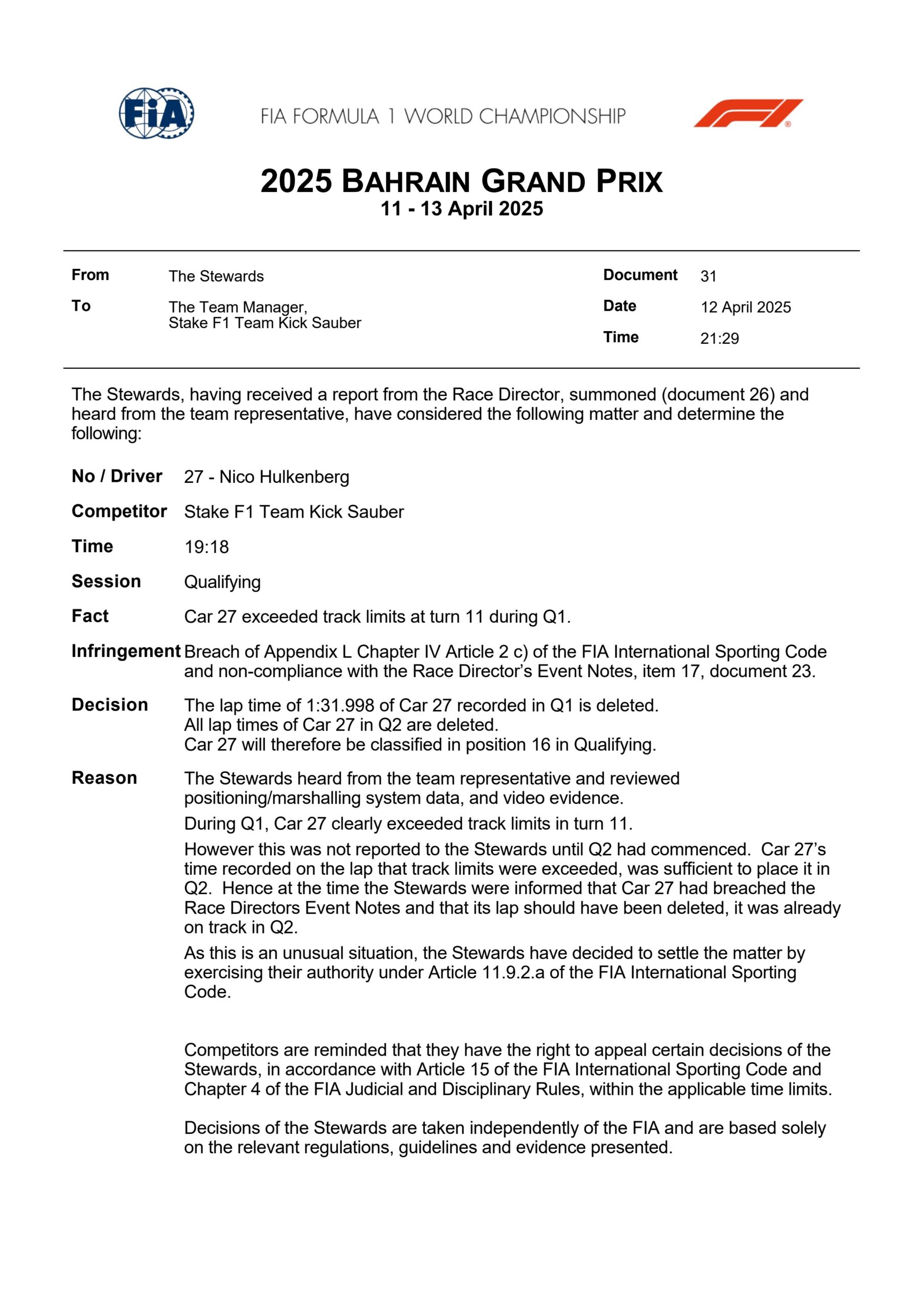 El otro: se recuerda específicamente el caso de la clasificación de Bahrein, cuando no se controló en detalle una transgresión de límites de pista por parte de Nico Hulkenberg (Sauber), que pasó a la Q2 cuando debieron haberle quitado el tiempo, perjudicando a Alex Albon (Williams). Se argumentó luego que los comisarios no habían podido fiscalizar todas las vueltas por falta de recursos.