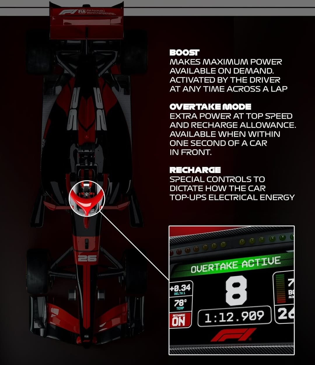 Pero esto no quiere decir que será imposible adelantar. Los coches de 2026 contarán con el denominado «Overtake Mode». Esto quiere decir que cuando un piloto esté a menos de un segundo de distancia del auto de adelante, podrán utilizar la energía eléctrica adicional para adelantar. A su vez aparece el «Boost», que será el encargado de activar la potencia máxima del motor y la batería.