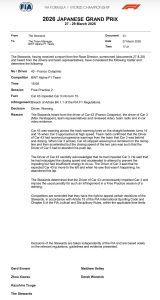 La desición fue acorde a este tipo de situaciones en prácticas: «Los comisarios determinaron que el piloto del auto 43 obstaculizó innecesariamente al auto 3 e impusieron la sanción habitual para este tipo de infracción en una sesión de entrenamientos libres: una advertencia».