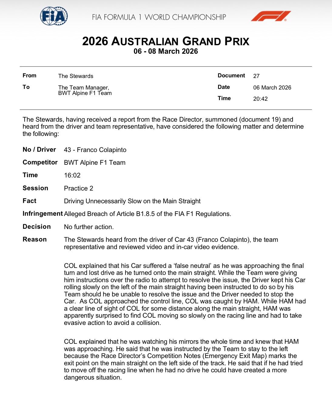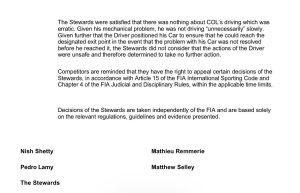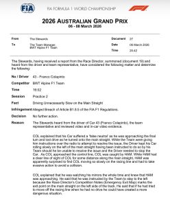 Frente a estas declaraciones del piloto de Alpine, los comisarios decidieron no aplicar sanciones. «Los comisarios consideraron que no hubo nada en la conducción de Colapinto que fuera errático. Dado su problema mecánico, no estaba conduciendo ‘innecesariamente’ lento. Considerando además que el piloto posicionó su auto para asegurarse de poder alcanzar el punto de salida designado en caso de que el problema con su auto no se resolviera antes de llegar allí, los comisarios no consideraron que las acciones del piloto fueran inseguras y, por lo tanto, determinaron no tomar más medidas», concluyeron.
