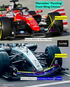 Los alerones delanteros de nueve de los once coches tienen una característica similar: están sujetos al chasis desde su plano principal. Solo Mercedes y Aston Martin mostraron algo distinto, sosteniéndolos desde el segundo plano, lo que reduce la cantidad de flaps móviles. Los analistas no se ponen de acuerdo acerca de cuál sería la bondad de este ingenio. ¿Una nariz más baja sin compromisos estructurales?