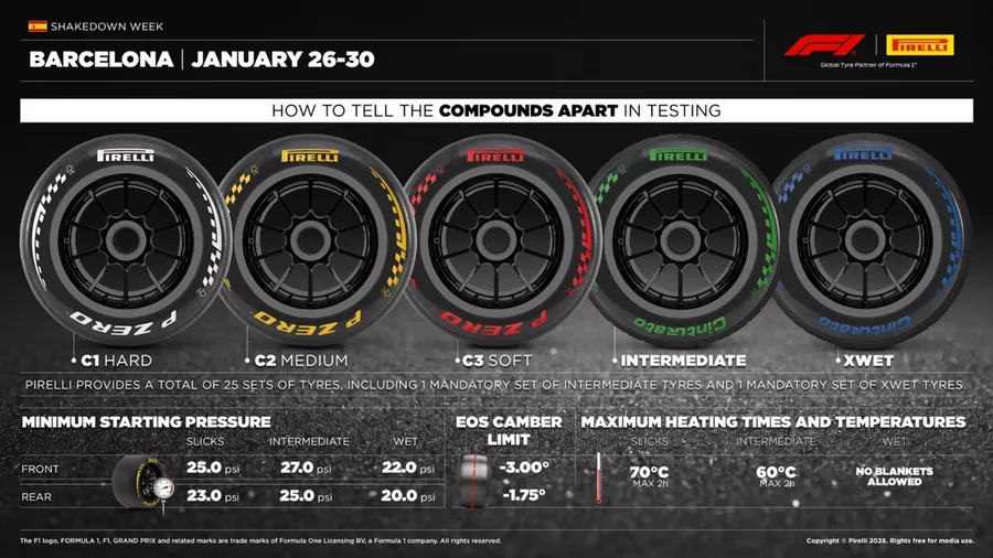 Si bien varios monoplazas ya rodaron en shakedowns privados, con un máximo de 15 kilómetros, o en filming days, limitados a 200 kilómetros, dichas salidas se realizaron con neumáticos de demostración. Se trata de compuestos distintos a los que Pirelli utiliza durante la temporada de Fórmula 1, por lo que los tests de Barcelona representarán la primera oportunidad real para evaluar los neumáticos que se utilizarán durante los Grandes Premios en 2026.