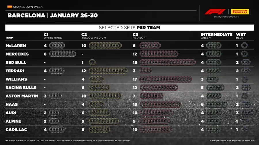 Pirelli reveló las elecciones de neumáticos de los equipos para los tests de pretemporada que se disputarán del 26 al 30 de enero en el Circuito de Barcelona-Cataluña. Ferrari se inclinó por los C2, mientras que Red Bull y Mercedes apostaron fuerte por los C3, en contraste con las selecciones más equilibradas de McLaren, Cadillac, Audi, Alpine y Aston Martin.