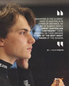 Además, agregó: «Singapur es la carrera más cercana a Australia en cuanto a distancia, así que siempre vemos un gran contingente australiano allí animando a sus pilotos en una de las mejores carreras nocturnas de la temporada. Es fantástico contar con ese apoyo adicional.»