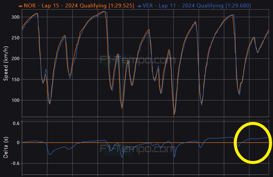 En ese pequeño tramo recto, que toma como curva, Norris «dobla» de 5 a 7 km/h más rápido que el neerlandés. Allí aseguró la pole-position que, un día más tarde, transformaría en una victoria por más de 20 segundos de ventaja.