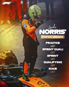 El inglés consolidó su imagen de favorito en el Mundial, con 24 puntos de ventaja sobre su compañero Oscar Piastri y 49 sobre el piloto de Red Bull, cuando quedan 83 en juego, pero mostró signos de preocupación: «No diría que el ritmo fue tan bueno como me hubiera gustado, así que hay algunas cosas que revisar».