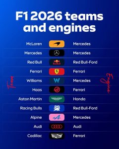 En 2026, la parrilla de Fórmula 1 contará con cinco fabricantes de motores: Honda, Ferrari, Ford, Audi y Mercedes. La marca alemana mantendrá su predominio, dado que tres equipos, además del suyo, utilizarán sus unidades de potencia: McLaren, Williams y Alpine, este último en lugar de Aston Martin, que iniciará su alianza con Honda.