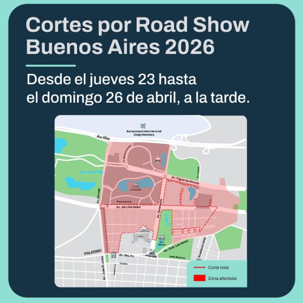 Según informan en el posteo, desde el jueves 23 hasta el domingo 26 (una vez terminado el evento), se pueden observar los lugares donde habrá cortes totales, así como la zona afectada. Desde Av. Figueroa Alcorta, hasta una parte de Av. Santa Fe, el area se encuentra cerrada.