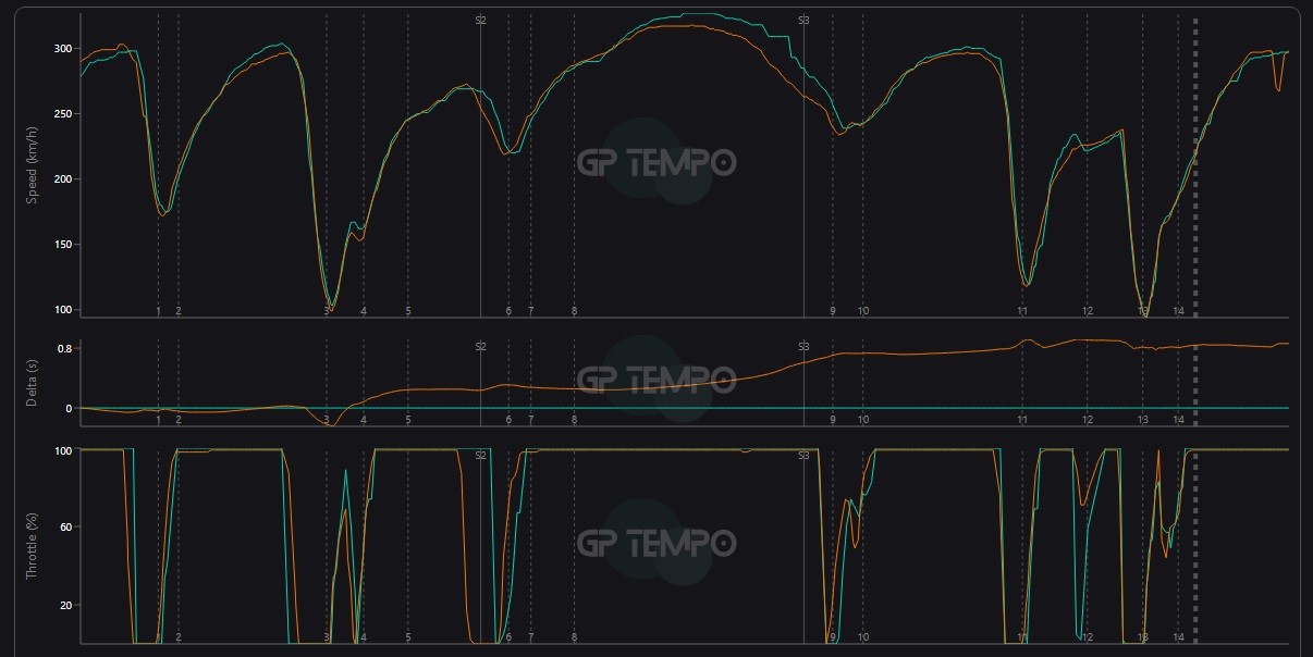 Veamos la comparación entre las vueltas rápidas de Russell y Piastri (ambos con el mismo impulsor) en el gráfico inferior. El australiano le sacó casi dos décimas de segundo hasta la curva 3, habiendo hecho Lift&Coast antes de la curva 1 y siendo 7 km/h más lento en la entrada a la 3. Pero al entrar en el sector 2, con otro Li&Co de Piastri, Russell ya está más de dos décimas adelante, sin gastar tanta energía eléctrica.