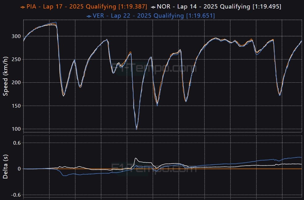 Porcentualmente, Verstappen mejoró más en clasificación que Norris o Piastri: 1,09% contra 0,98% y 0,83%, respectivamente. Pero los McLaren no cambiaron la puesta a punto y parecen tener mucho mejor ritmo que el coche del campeón, que siguió rebotando en el asfalto. En el Sector 3 fueron muy superiores, como se ve en la telemetría de la mejor vuelta de cada uno: