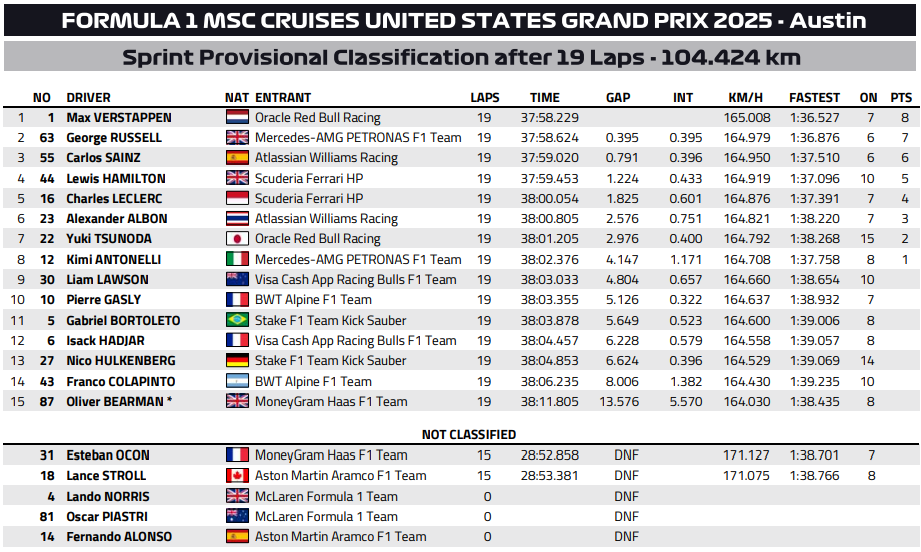 Max Verstappen ganó la carrera Sprint del Gran Premio de Estados Unidos. George Russell (2º) y Carlos Sainz (3º) completaron el podio. Sólida actuación del piloto neerlandés, que alcanzó su décimotercera victoria en este formato desde su creación en 2021. Es la cuarta carrera Sprint del año: la primera quedó en manos de Lewis Hamilton en China, la segunda fue para Lando Norris en Miami. Verstappen dominó en Spa y Austin. La próxima será en el Gran Premio de Brasil, el 8 de noviembre.
