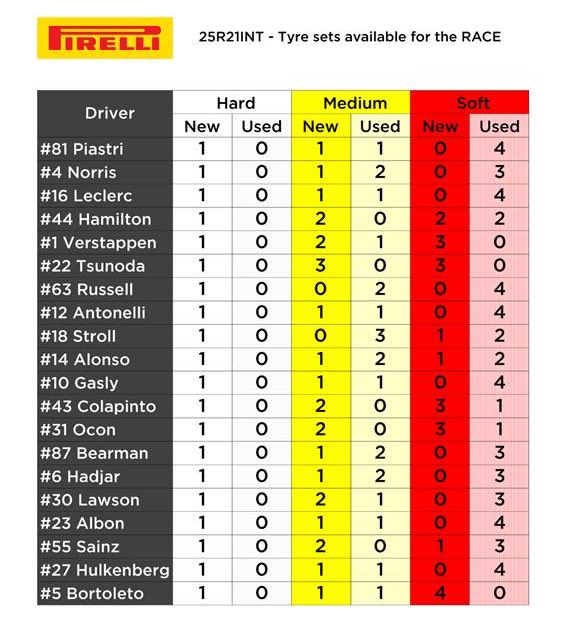 Norris, Leclerc, Piastri, Russell, Hulkenberg, Albon y Colapinto salen con neumáticos MEDIOS. Antonelli, Hadjar, Lawson, Bearman, Gasly, Hamilton, Sainz y Bortoleto van con BLANDOS. Alonso, Stroll, Tsunoda, Verstappen y Ocon van con DUROS.