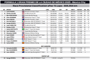 Nico Hulkenberg se suma a Liam Lawson y abandona la carrera en México. Carlos Sainz recibe una penalización de cinco segundos por exceder la velocidad límite en el pitlane. Fantática carrera de Oliver Bearman, quien pelea por un puesto en el podio.